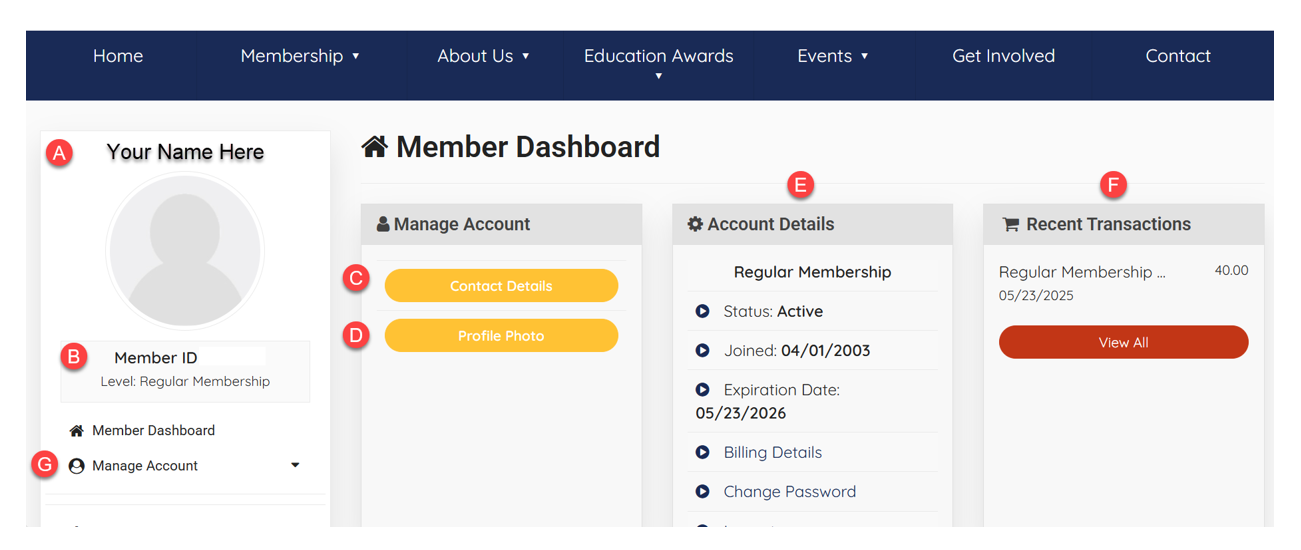 - This is your name as it shows in your membership profile. Below your name you will see your profile picture, if you have uploaded one. Both your name and your photo can be updated under the links marked “C” and “D” in this tutorial.